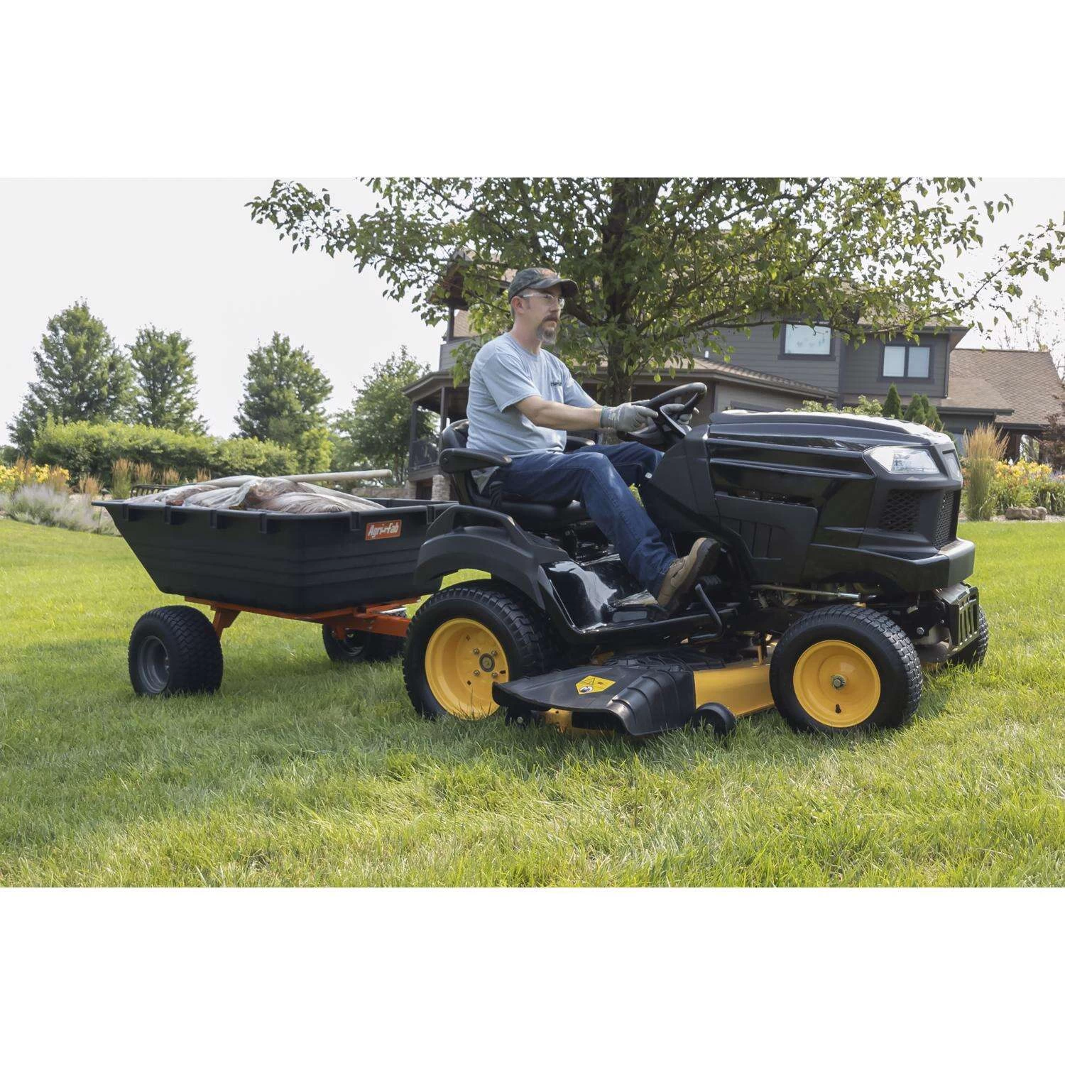 The Agri-Fab swivel cart lets you get where you want to go and makes the most of your time. In addition to attaching to your lawn and garden tractor this cart is also ATV/UTV compatible. The swivel feature lets you turn the cart up to 100 for easy dumping. The quick release foot lever allows for easy hands-free dumping. Higher clearance lets you travel over rough terrain. Carts are the best way to move loads from one place to another no need to go back and forth to retrieve mulch, dirt, fertilizer or any load. Durable poly bed, steel frame with scratch resistant powder-coat paint All terrain pneumatic tires allow for easy maneuverability over the roughest terrain Wheels feature grease zerks for easy maintenance and long life Quick release foot lever Welded wheel support for heavier loads on rougher terrain Heavy 12 ga. steel tongue prevents twisting and bending